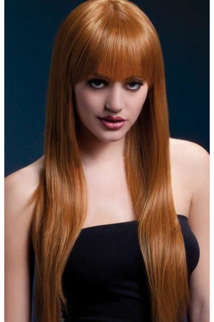 Long straight with fringe, 26 in. (66 cm), adjustable wig cap and natural faux skin crown.