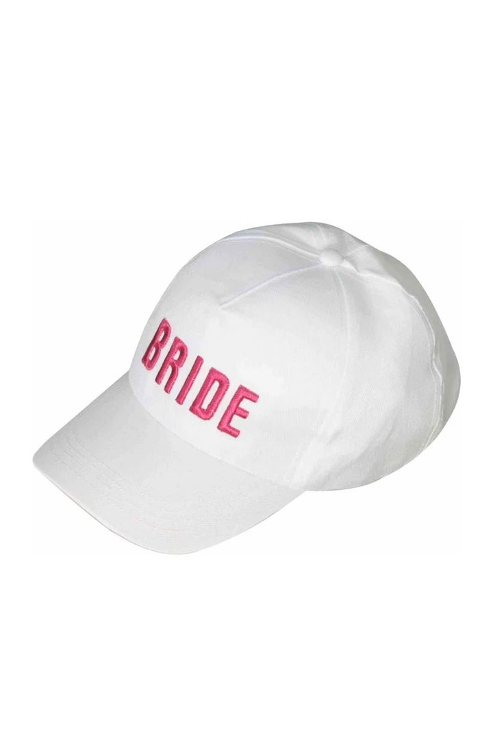 A white hat with light pink writing. Easy to decorate and customize!