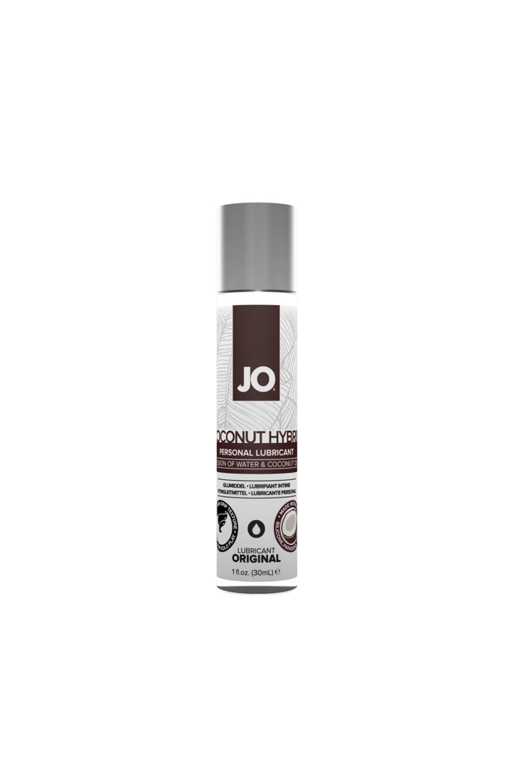 Jo Coconut Hybrid lube is a combination of water and silky smooth coconut oil. Paraben and glycerin free, with a creamy white, non-drip formula and mild coconut flavor and aroma. Safe for toys.