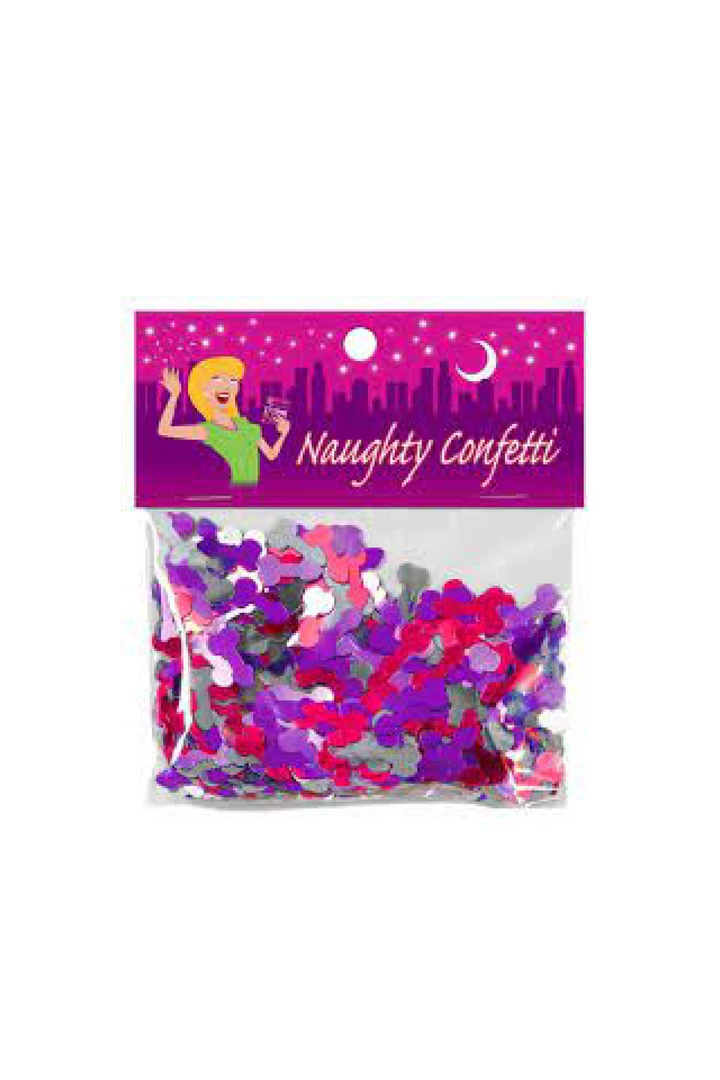 Naughty Confetti includes 15 grams of pecker-shaped confetti in four metallic colors:red, purple, blue and pink.