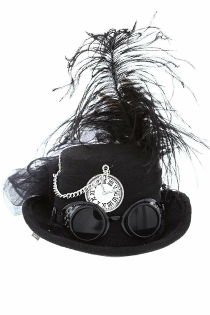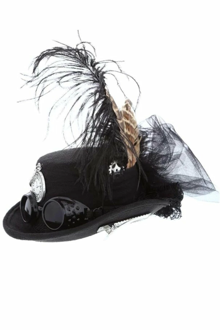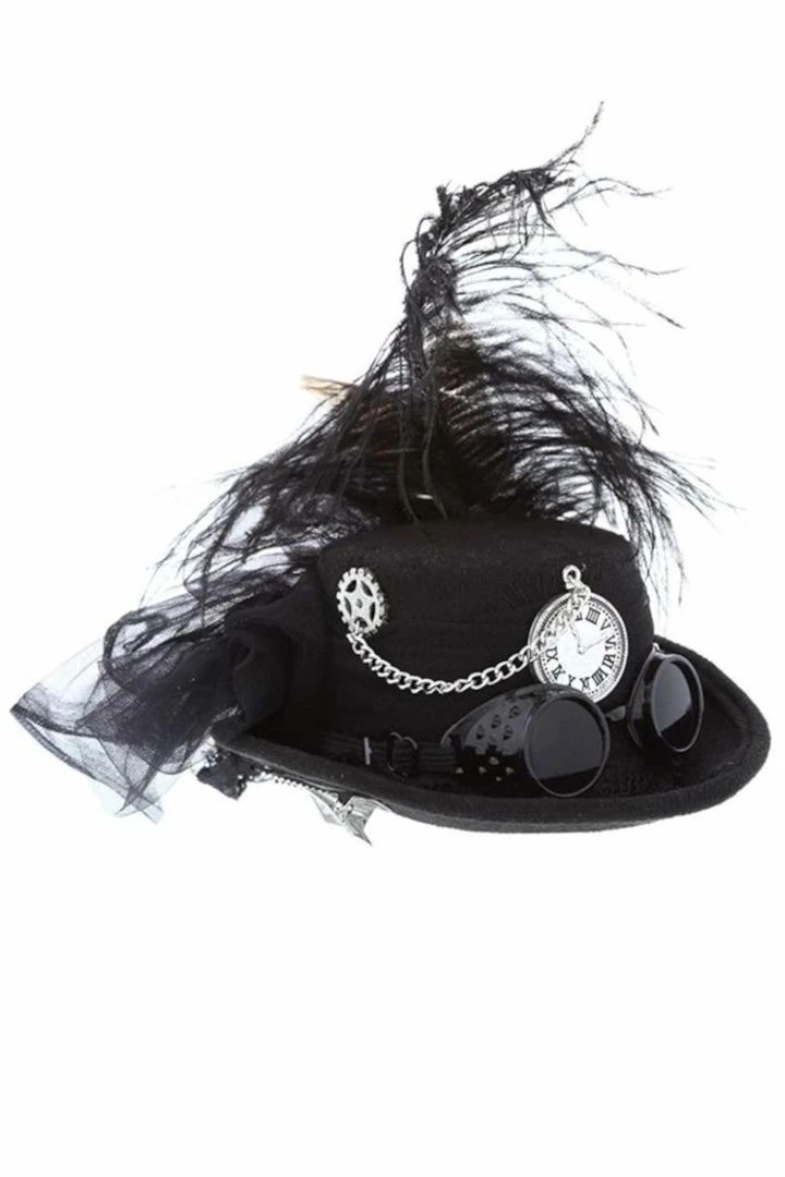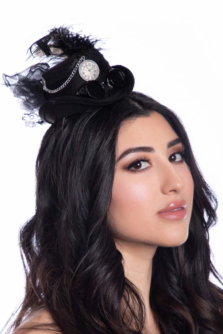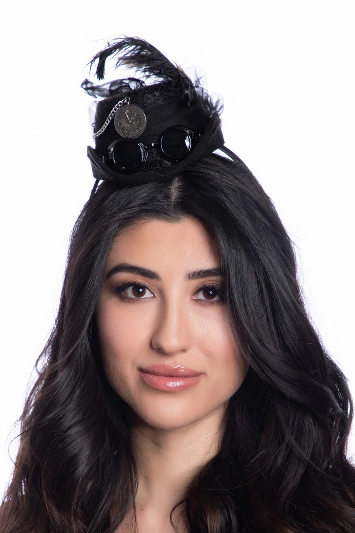 Get steamy with this black suede mini top hat, decorated with feathers, mesh & lace, gears, and mini goggles! The perfect accessory for any time traveler.