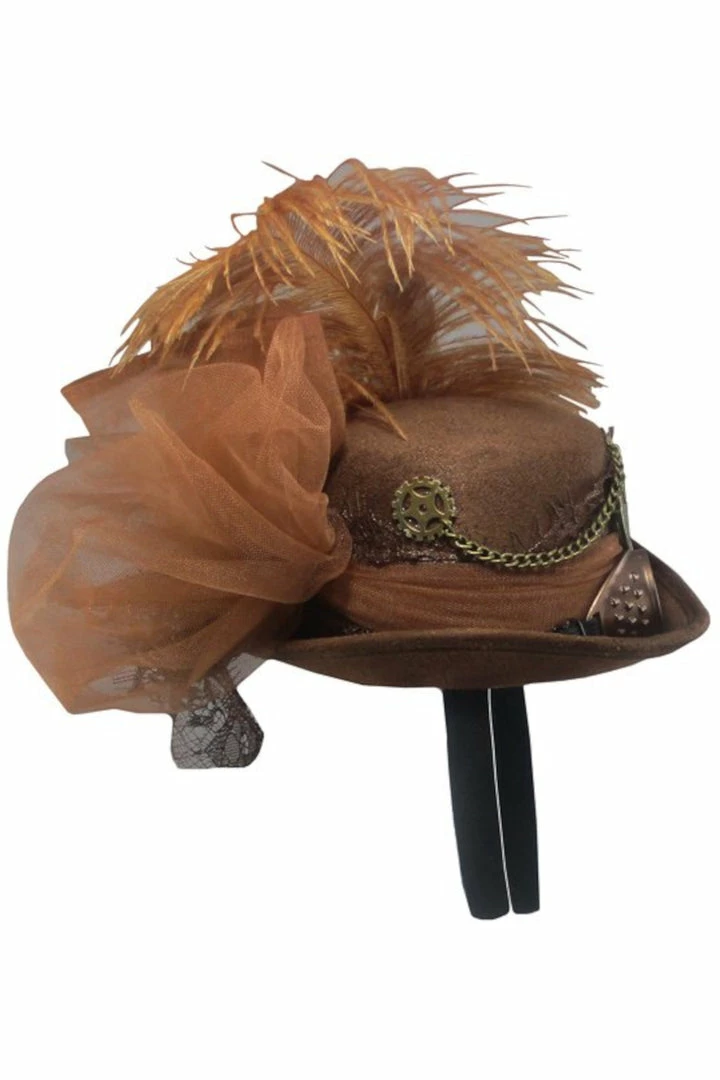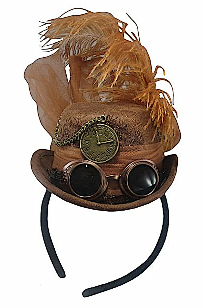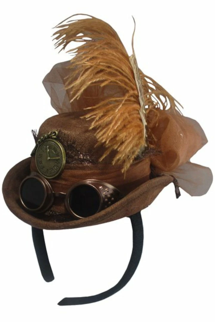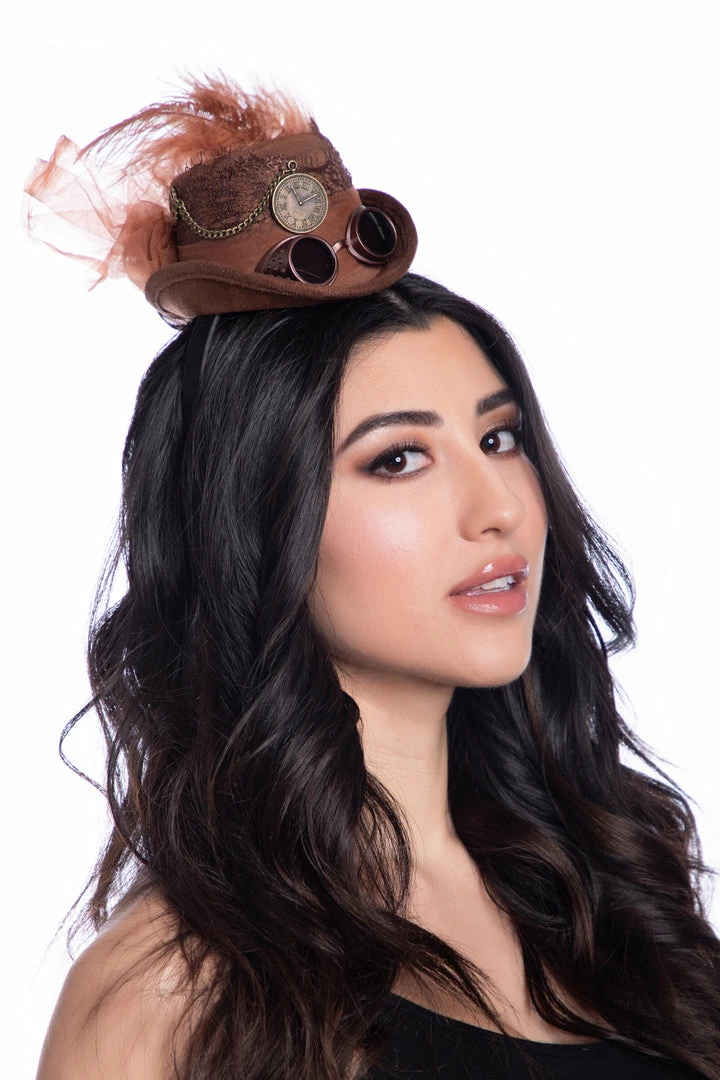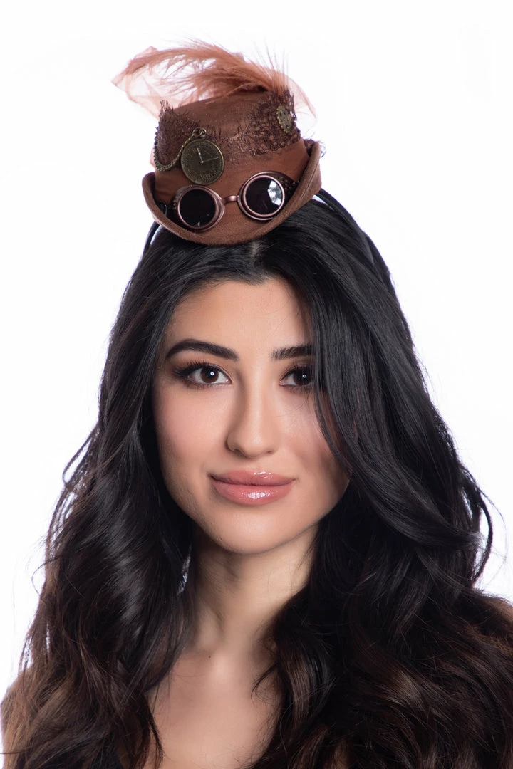 Get steamy with this brown suede mini top hat, decorated with feathers, mesh & lace, gears, and mini goggles! The perfect accessory for any time traveler.